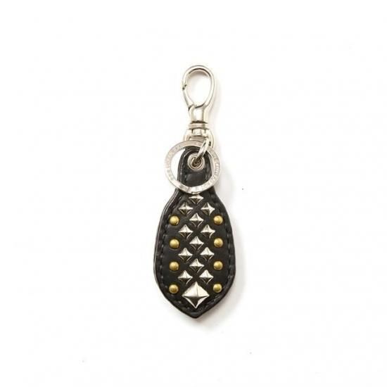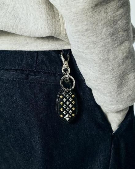 スタッズレザー作製されたラギッド型キーリング。ピラミッドスタッズと、ブラス加工ラウンドスタッズを配した。