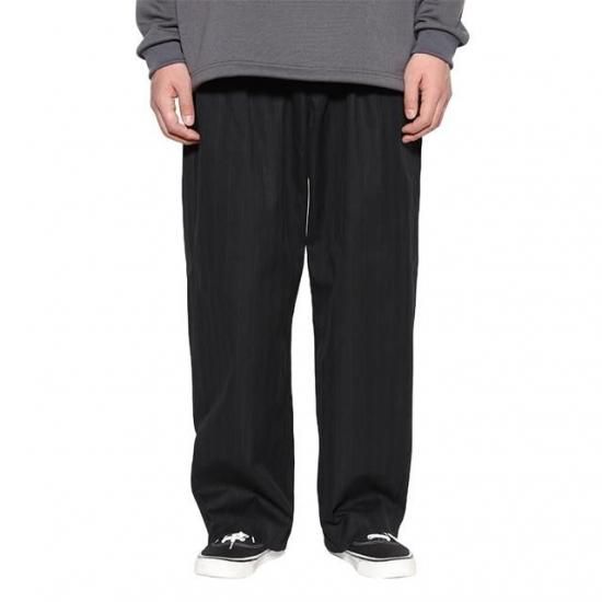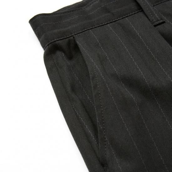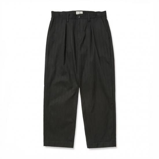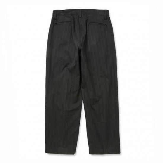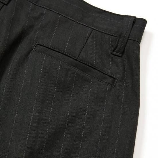 ダブルクロスストライプタックトラウザーズ。ドビー織りのストライプ生地を採用。60's〜70'sの日本製ヴィンテージウールスラックスをモチーフに、コットン素材に置き換えた生地。打ち込みを限界まであげる事で、肉感やハリのある素材とイージーケア性も備えている。全体的にゆとりを持たせたワンタック入りのワイドストレートシルエット。