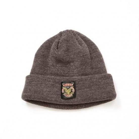 折り返し杢ニットCAP。アクリルとウールの混紡の杢糸で編み上げ、折り返しにネームが付く。