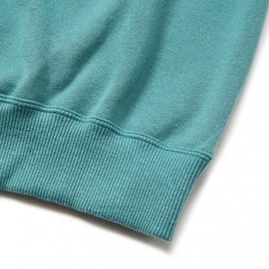 クルーネックスウェットシャツ。希少性の高い旧式の丸編み機を使用した、国産30/10裏毛で製作。最新の編み機に比べると、編み上げるのに時間が掛かり生産性は劣りますが、ゆっくりと編み上げられた裏毛はふっくらと柔らかい風合いを持ち、裏のループも美しく仕上がっているのが特徴。フロント左胸に刺繍、バックにプリントが入る。