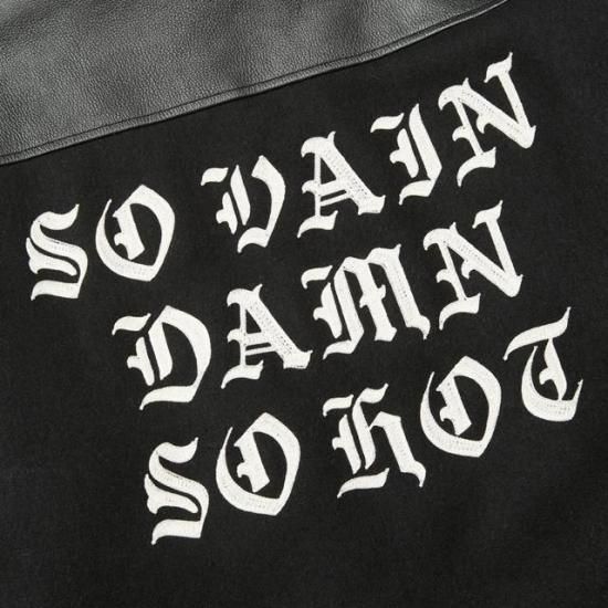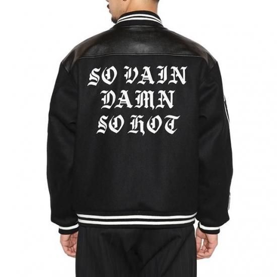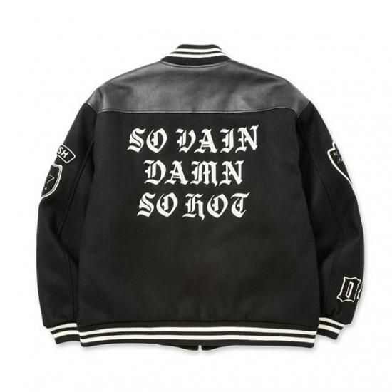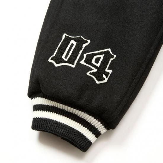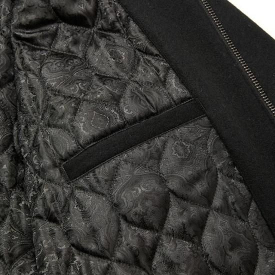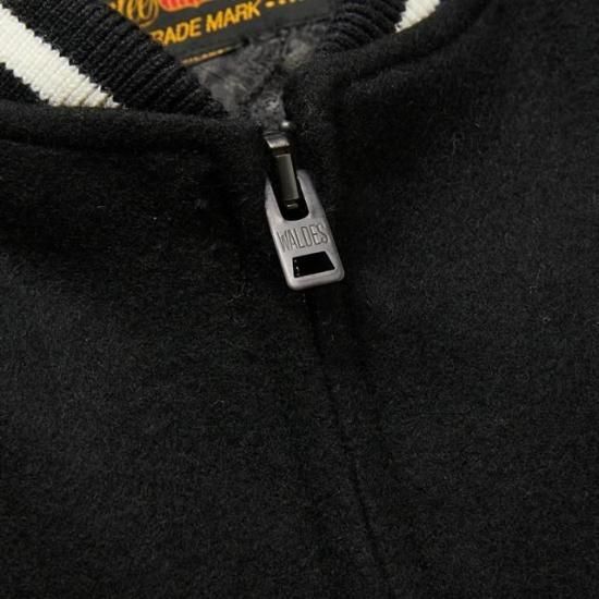 ウールメルトンスタジャン。打ち込みが強い、ウール混率90%の国産の高品質ウールメルトンを採用。ヨーク部分をレザーで切り替え、裏地はオリジナルペイズリー柄の中綿キルト仕様。左胸、両袖にサガラワッペン、右胸、バックにチェーン刺繍が入る。