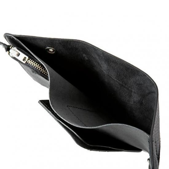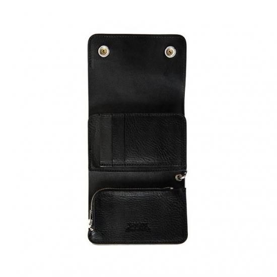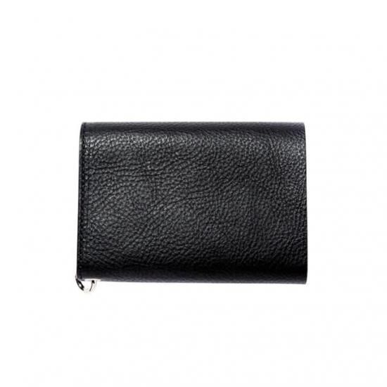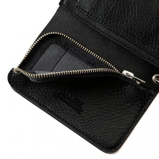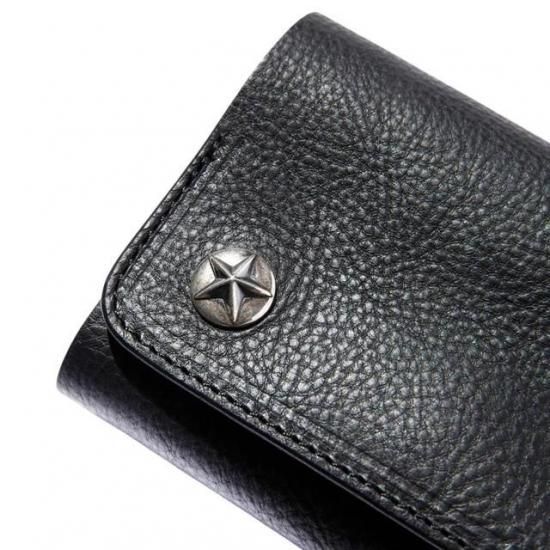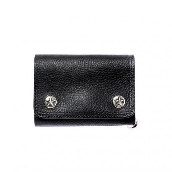 シルバーのスターコンチョボタンを使用し、作製された三つ折りタイプのハーフウォレット。レザーにはシボ感あるレザーを採用。使い込む程にシボが消え、艶感ある経年変化を楽しむ事が出来る。また、収納もしっかりと確保し、使い勝手の良いウォレットに仕上がっている。
